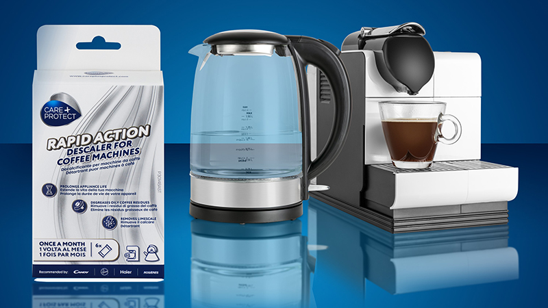 Remove the limescale build-up and remove any tea and coffee residues with the Care+Protect coffee machine and kettle descaler powder.