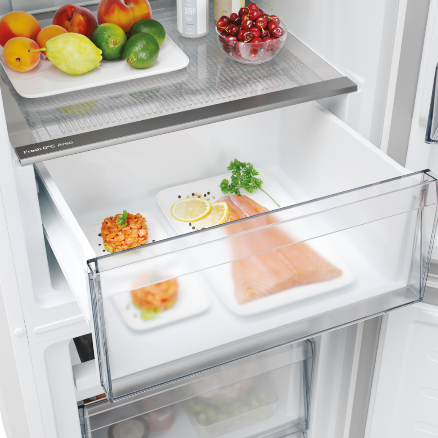 Fresco incluye la Adaptive Humidity Area*, un amplio espacio diseñado para tus frutas y verduras que mantiene el nivel de humedad ideal gracias a Natura Fiber. Además, cuenta con la Fresh 0°C Area, un cajón que se adapta a tus necesidades de almacenamiento: cuando lo configuras a 0°C es ideal para carne y pescado, mientras que cuando está apagado, puede utilizarse como un cajón adicional.