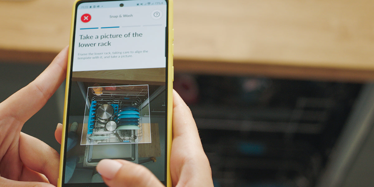 Haz una foto de tu cesta cargada y obtén consejos para cargarla correctamente. Puedes averiguar fácilmente cuál es el programa más rápido que se adapta al tamaño y tipo de carga, gracias a la función Snap & Wash directamente en tu aplicación Candy hOn.
