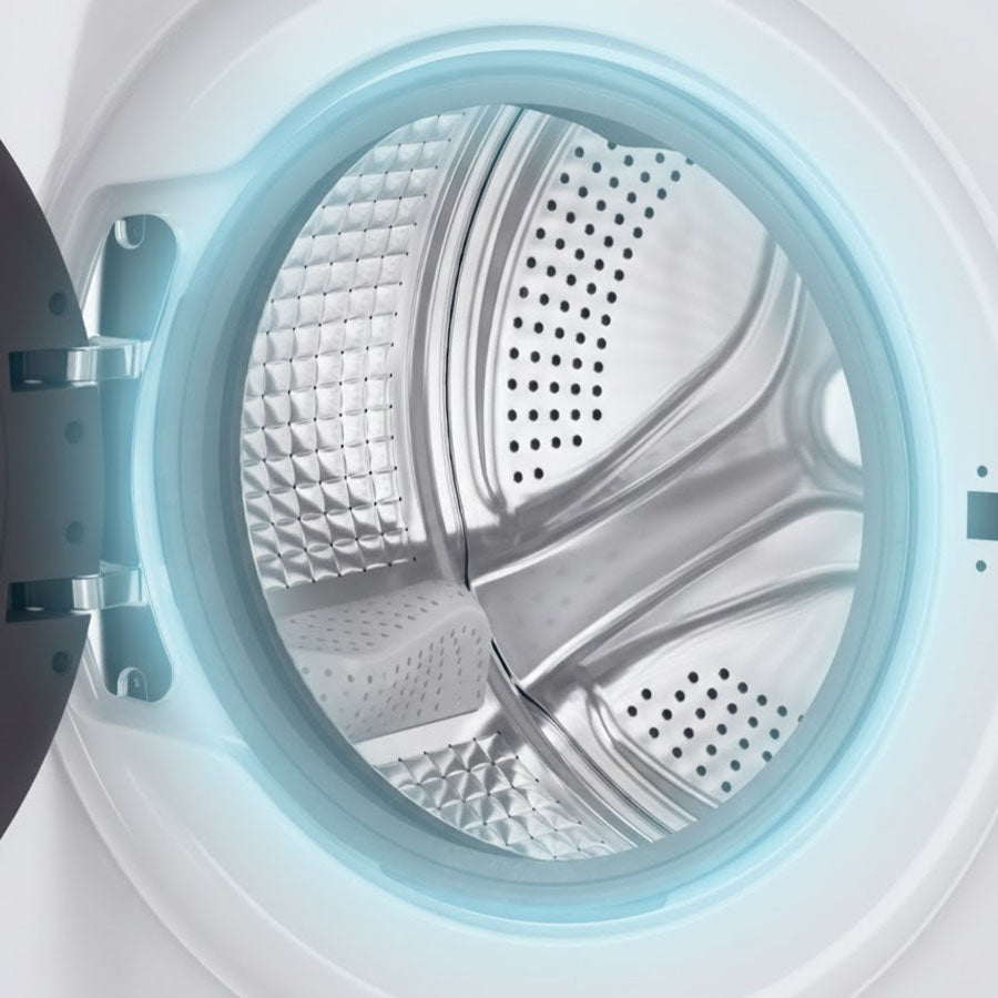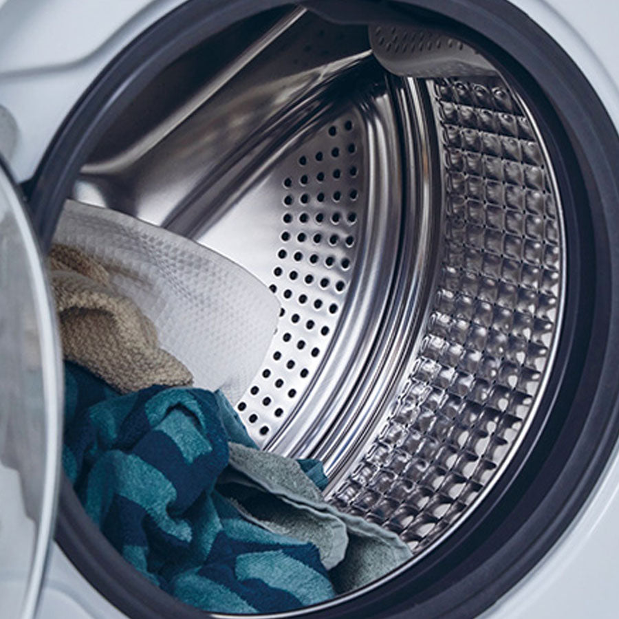 El tambor está fabricado en acero inoxidable con una superficie interna "almohadillada" que reduce la fricción y protege las fibras incluso en los ciclos más intensos. Gracias a esta estructura, las prendas mantienen su suavidad y sus colores originales por más tiempo.