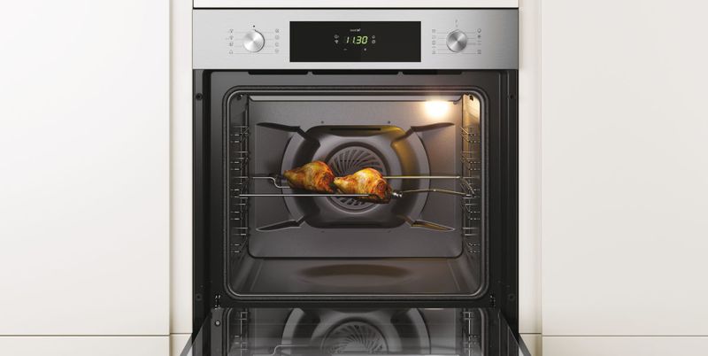 Le tournebroche fonctionne avec l'élément chauffant supérieur, en faisant tourner les aliments peuvent être cuits de manière homogène. La température de chauffage peut être ajustée selon les besoins. Le tournebroche est mieux utilisé pour les aliments de taille moyenne. Idéal pour redécouvrir le goût du rôti traditionnel. Aucun préchauffage n'est requis pour la cuisson au tournebroche.