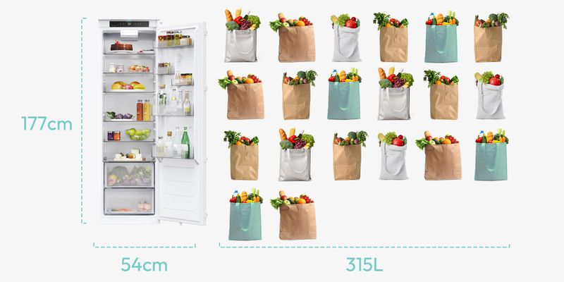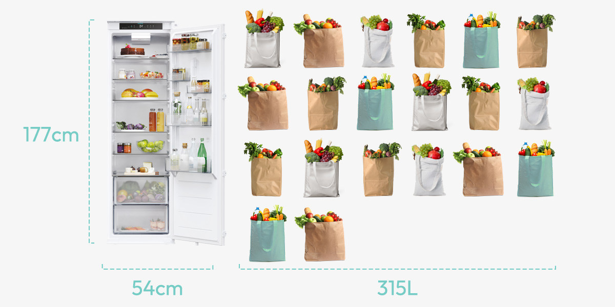A lenyűgöző 315 literes kapacitású, teljes magasságú, egyajtós hűtő akár a legnagyobb bevásárlásokat is könnyedén elhelyezi, és rendezetten, gondtalanul tárolja az élelmiszereket.