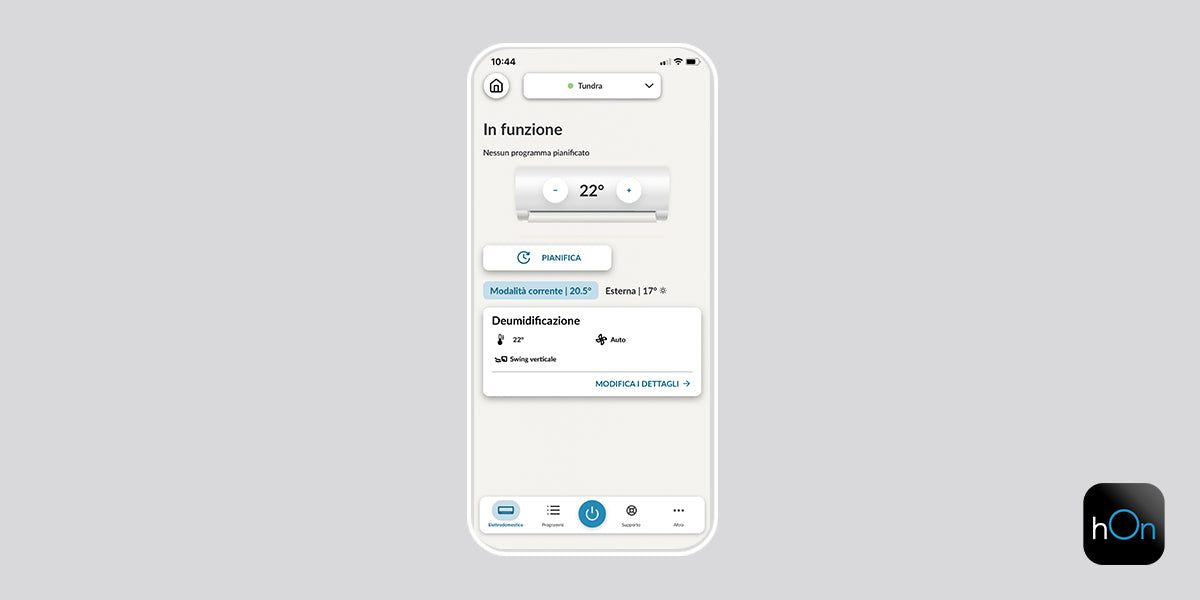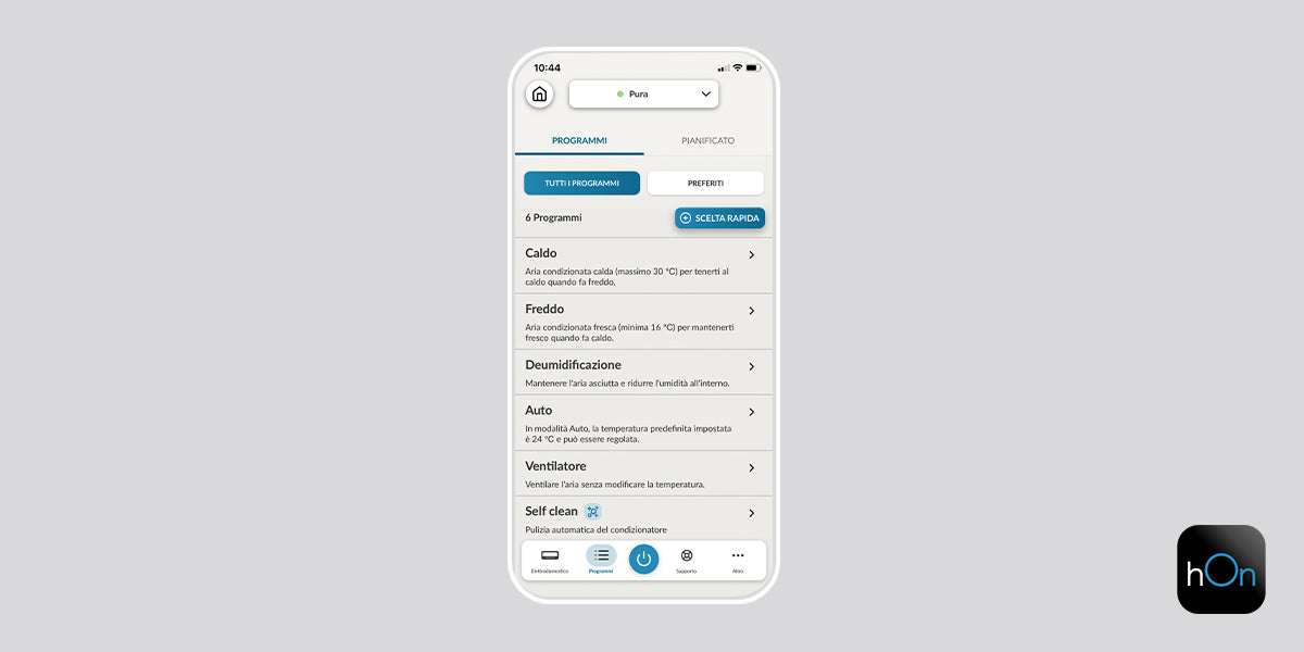Grazie all’app hOn, potrai gestire Pura direttamente dal tuo smartphone o tablet. Accendilo e spegnilo, regola la temperature e le impostazioni ovunque ti trovi. In più, potrai programmare l’accensione e lo spegnimento in base alle tue necessità, impostare un determinato Mode per un periodo prestabilito (come l’Holiday Mode), monitorare le previsioni del tempo e molto altro ancora.