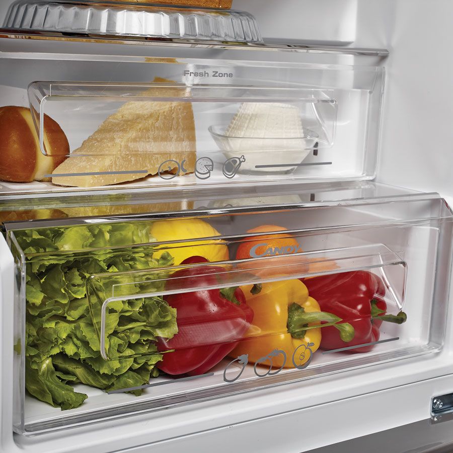 Občutite ergonomsko zasnovo za udobno uporabo brez sklanjanja. Spoznajte novi predal za sadje in zelenjavo z uravnavanjem temperature ter predal Fresh Zone za sveža živila, kot so meso, sir in ribe. Oba predala imata teleskopska vodila, ki omogočajo še lažje in tišje odpiranje, ter srebrne oznake, ki prikazujejo živila, primerna za shranjevanje v posameznem predalu.