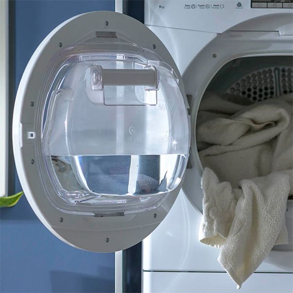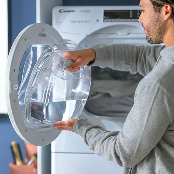 To pa še ni vse: Candy je patentiral unikaten sistem EasyCase, edini resnično preprost sistem za zbiranje vode, ki je enostavno dostopen kar na notranji strani vrat stroja. Ko se v ergonomsko oblikovani posodi nabere voda, jo zlahka odstranite neposredno iz vrat. Posodo lahko odstranite in izpraznite hitro in samo z eno roko.